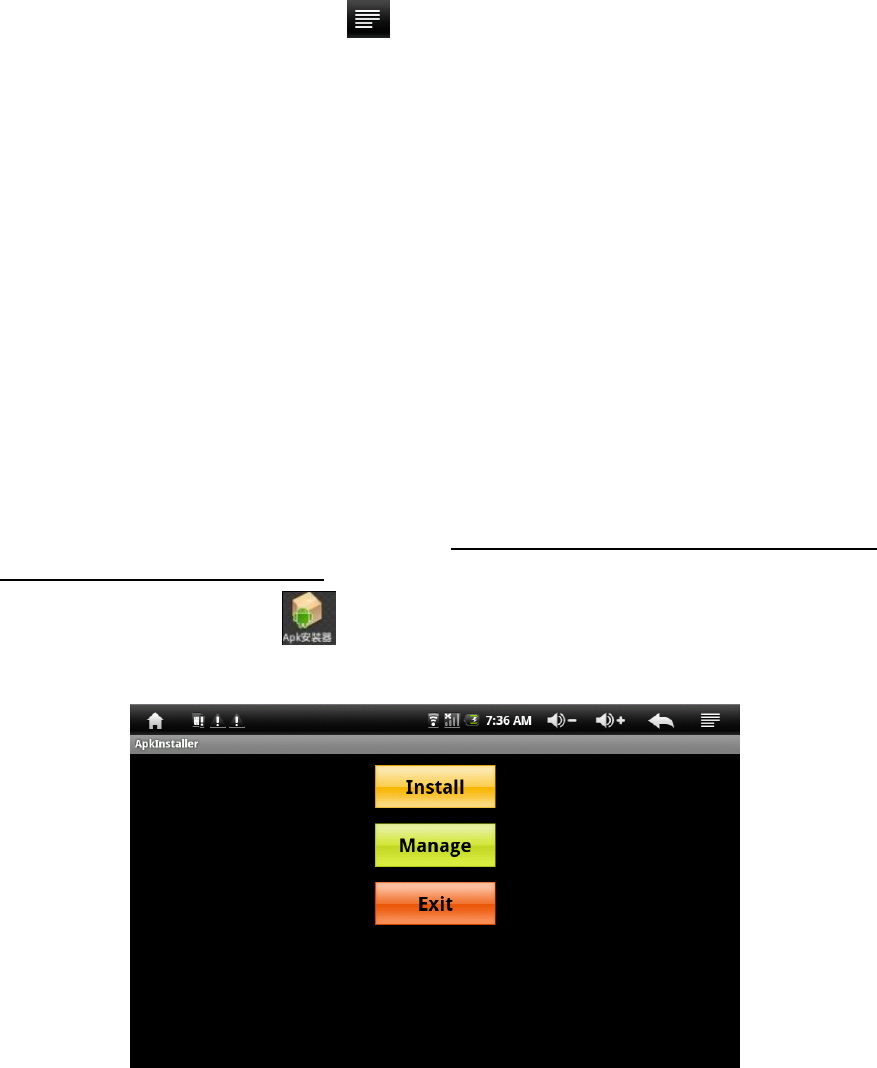 This device supports the third party‟s Application Package (APK format) based on Android